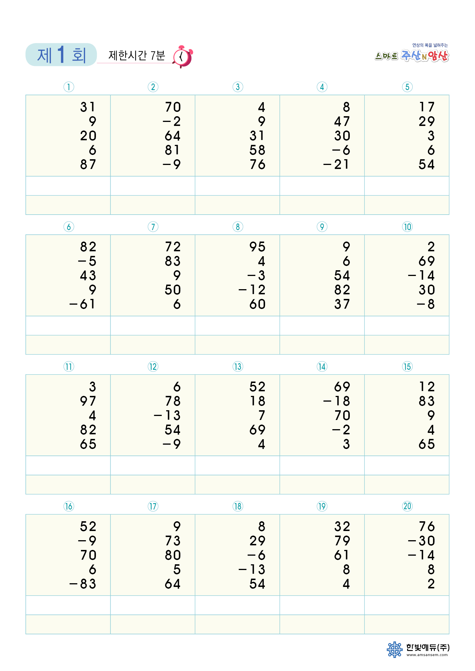 주산으로 계산하는 경우 제한시간 7분 (암산하기 전 단계로 연습)