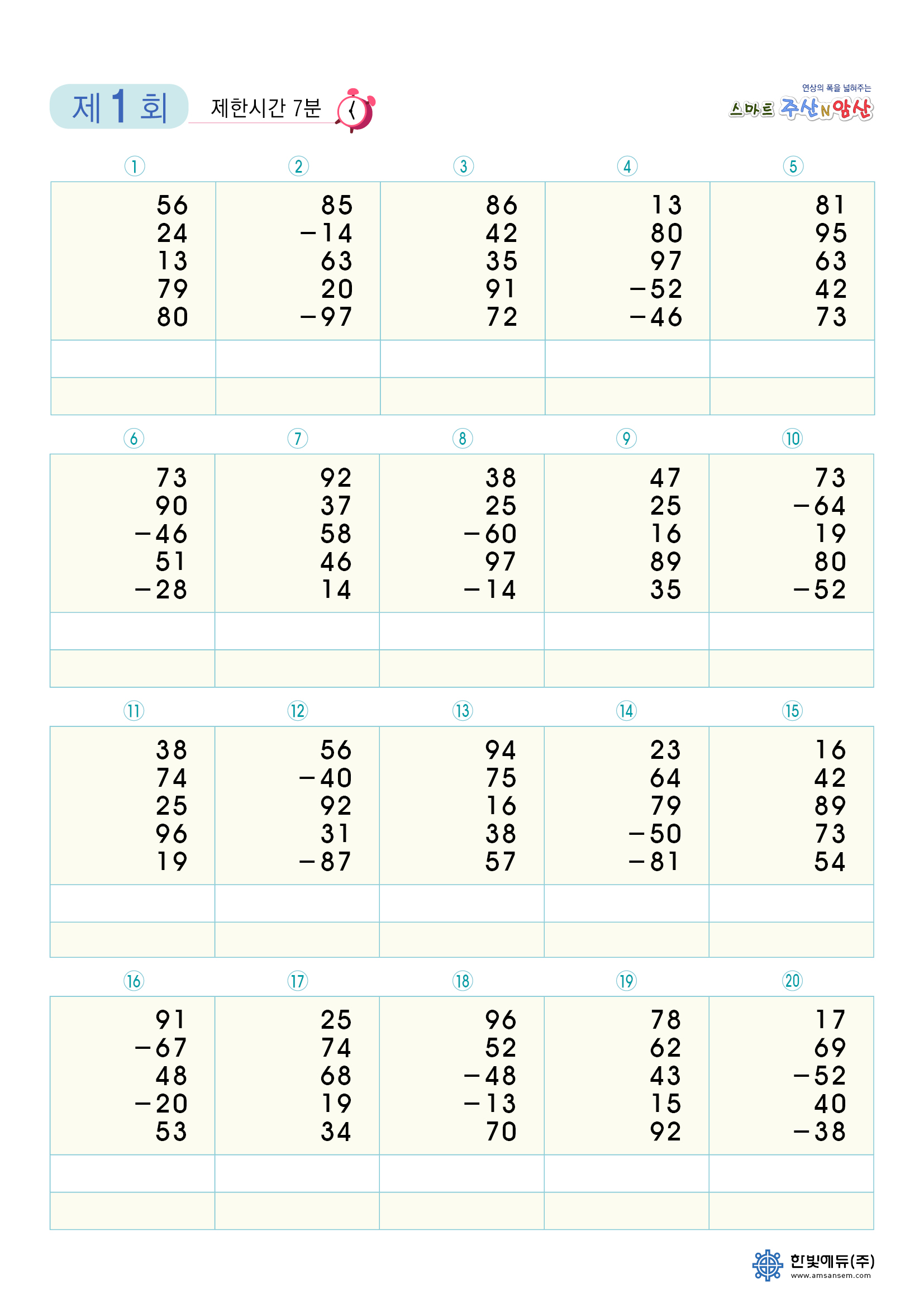 주산으로 계산하는 경우 제한시간 7분 (암산하기 전 단계로 연습)